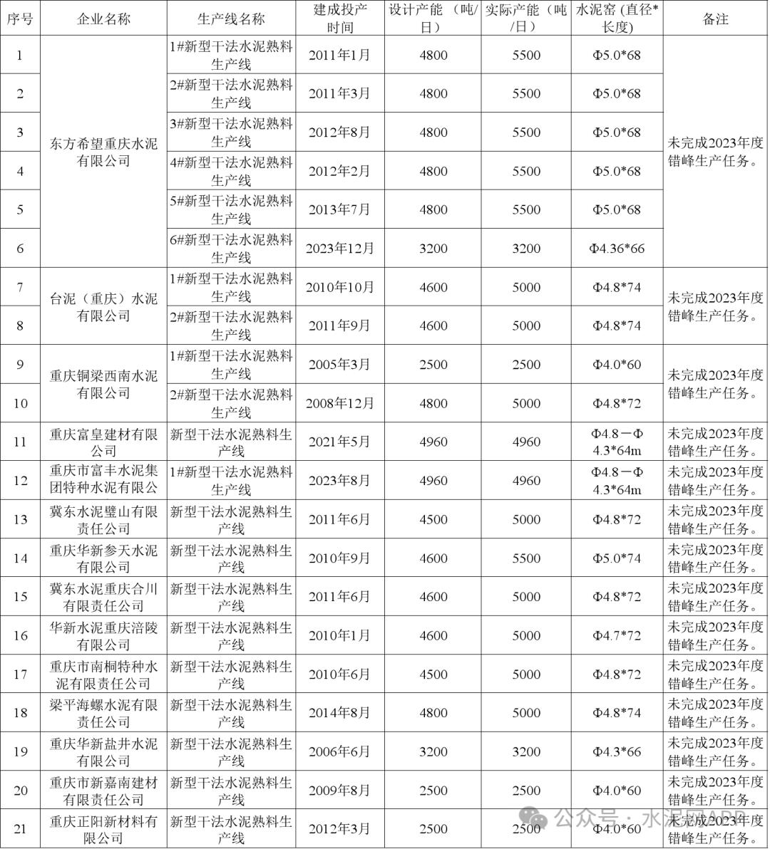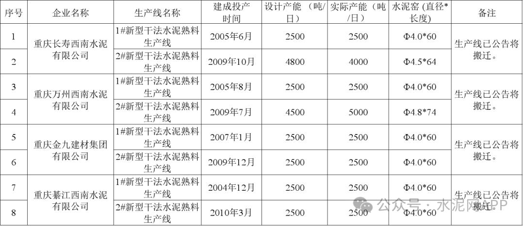 根據(jù)公示清單,截至2023年12月31日,重慶市共計(jì)47條水泥熟料生產(chǎn)線,其中:14家企業(yè)21條生產(chǎn)線未完成2023年度錯(cuò)峰生產(chǎn)任務(wù);8條生產(chǎn)線已公告將搬遷。未完成2023年度錯(cuò)峰生產(chǎn)任務(wù)清單