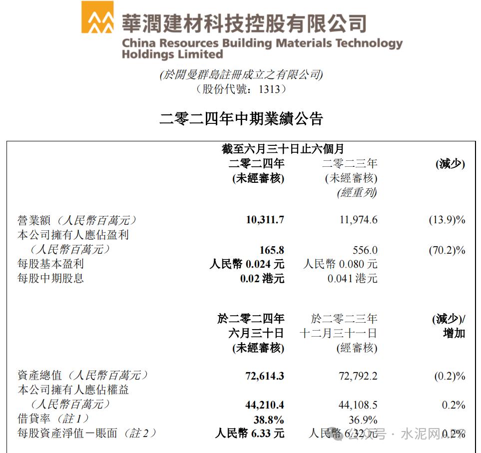 華潤建材科技2024上半年歸母凈利潤1.66億 同比減少70.2%