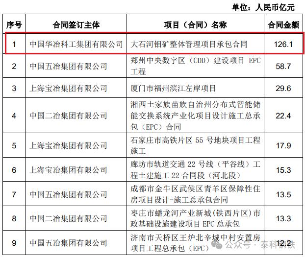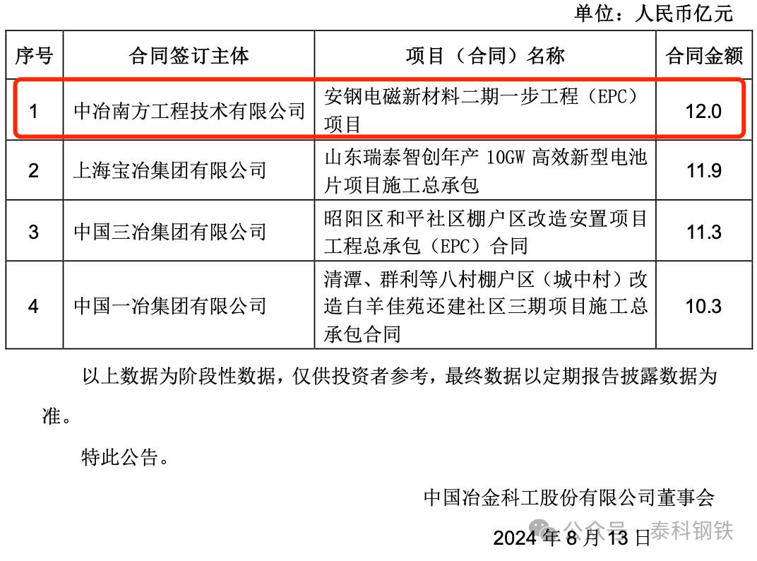 2024年8月,中國中冶發(fā)布2024年1-7月經營情況公告:中國中冶2024年1-7月新簽合同額人民幣7,504.4 億元,較上年同期降低 6.4%,其中新簽海外合同額人民幣443.9 億元,較上年同期增長 83.0%。其中中冶南方工程技術有限公司7月新簽安鋼電磁新材料二期一步工程(EPC) 項目,合同額12.0億元。1-7月單體最大的為中國華冶科工集團有限公司6月新簽大石河鉬礦整體管理項目承包合同,合同額高達126.1億元!中冶國際工程集團有限公司和中冶賽迪集團有限公司簽下俄羅斯蘇洛亞姆釩鈦磁鐵礦及冶金綜合體項目,合同額108億元。