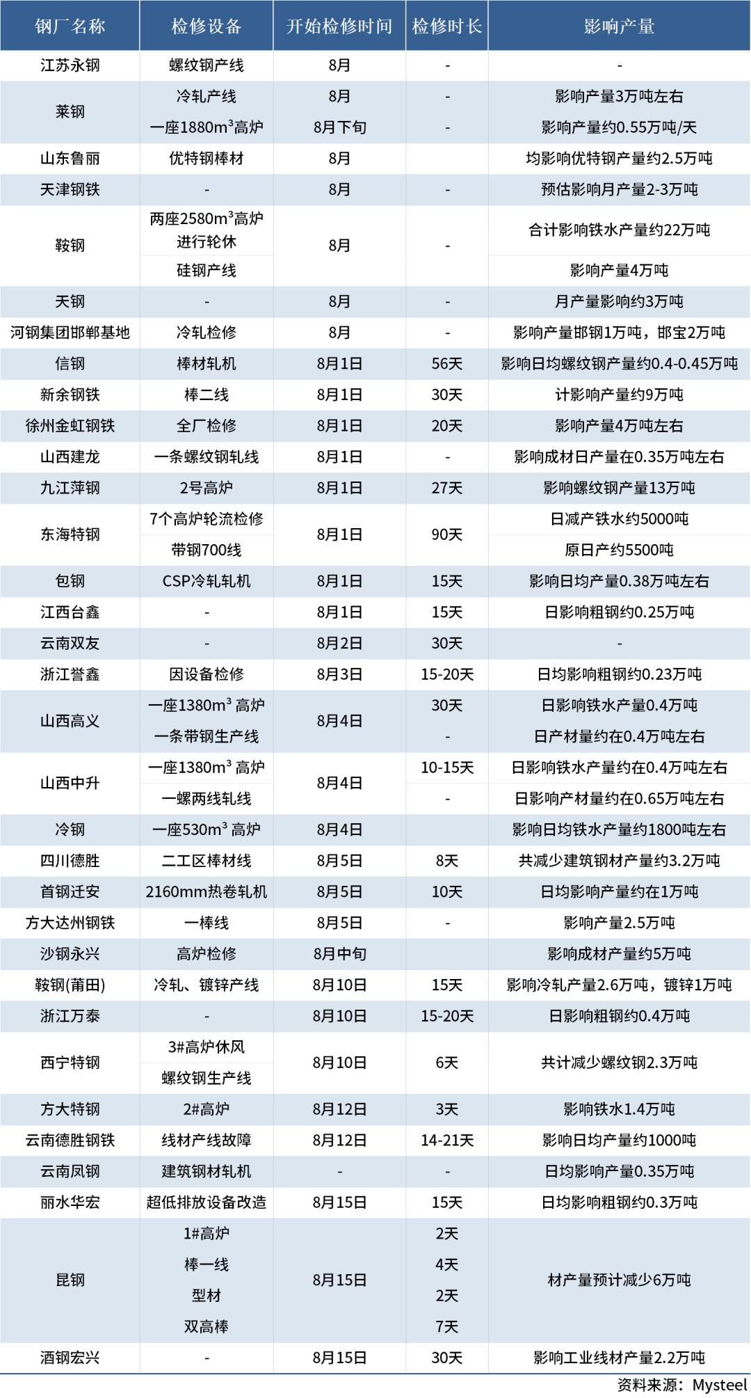 01.8月鋼廠停產(chǎn)檢修情況