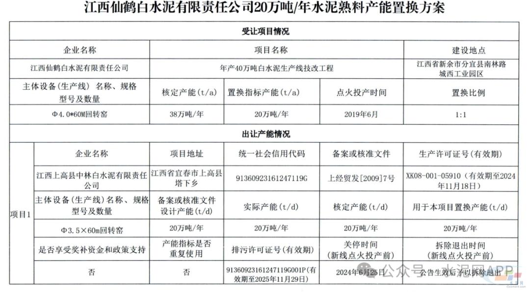 近日,江西省工信廳有兩條公示信息,一是關(guān)于江西仙鶴白水泥有限責(zé)任公司水泥熟料產(chǎn)能置換方案的公示;二是關(guān)于江西仙鶴白水泥有限責(zé)任公司10萬(wàn)噸/年水泥熟料原置換產(chǎn)能退出情況公示。產(chǎn)能置換方案如下: