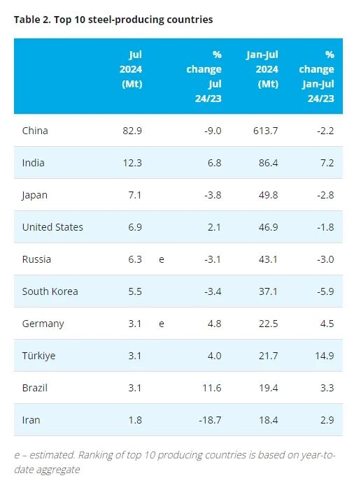 世界鋼鐵協(xié)會數(shù)據(jù)顯示,2024年7月全球71個納入世界鋼鐵協(xié)會統(tǒng)計國家的粗鋼產(chǎn)量為1.528億噸,同比下降4.7%。其中,中國粗鋼產(chǎn)量同比下降9.0%,降至8290萬噸。印度7月粗鋼產(chǎn)量為1230萬噸,同比增加6.8%;今年1-7月粗鋼產(chǎn)量為0.864億噸,同比增加7.2%。