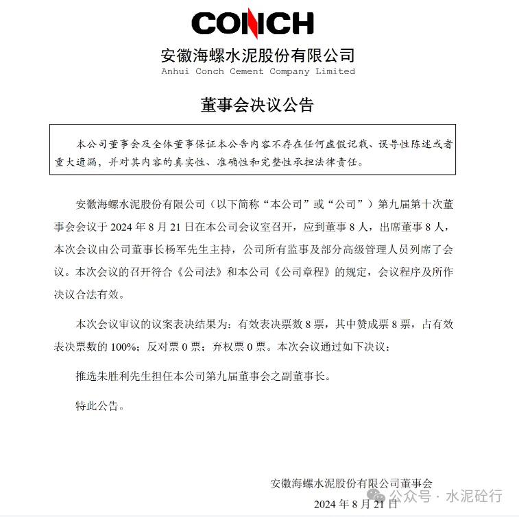 8月21日晚間,海螺水泥發(fā)布董事會決議公告,推選朱勝利先生擔(dān)任本公司第九屆董事會之副董事長。