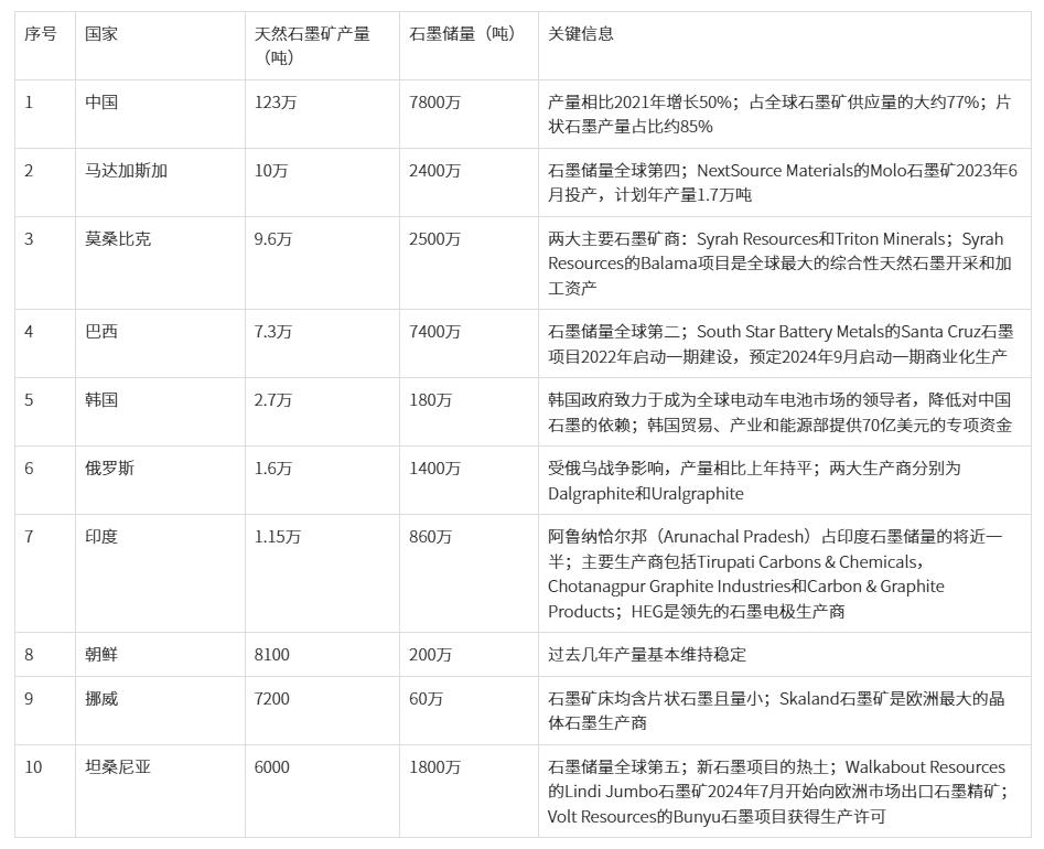根據(jù)美國地質(zhì)勘探局的數(shù)據(jù),以下是全球天然石墨礦產(chǎn)量最高的十個國家以及它們的石墨儲量: