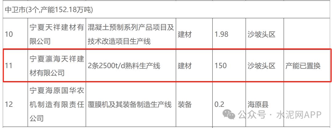 其中,包括中衛(wèi)市寧夏瀛海天祥建材有限公司2條2500t/d熟料生產(chǎn)線,退出產(chǎn)能合計150萬噸。