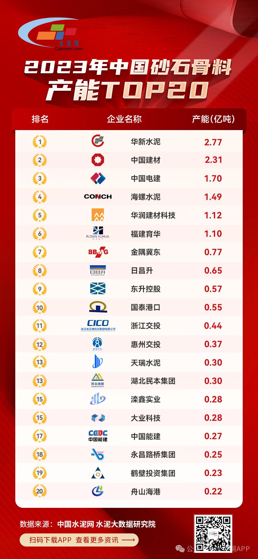據(jù)中國水泥網(wǎng)4月發(fā)布的2023年中國砂石骨料TOP20產(chǎn)能排行榜顯示,2023年華新水泥砂石骨料產(chǎn)能2.77億噸,位居榜首。