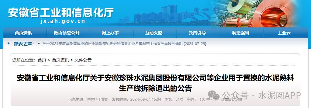 9月4日,安徽工信廳發(fā)布“關于安徽珍珠水泥集團股份有限公司等企業(yè)用于置換的水泥熟料生產(chǎn)線拆除退出的公告”。