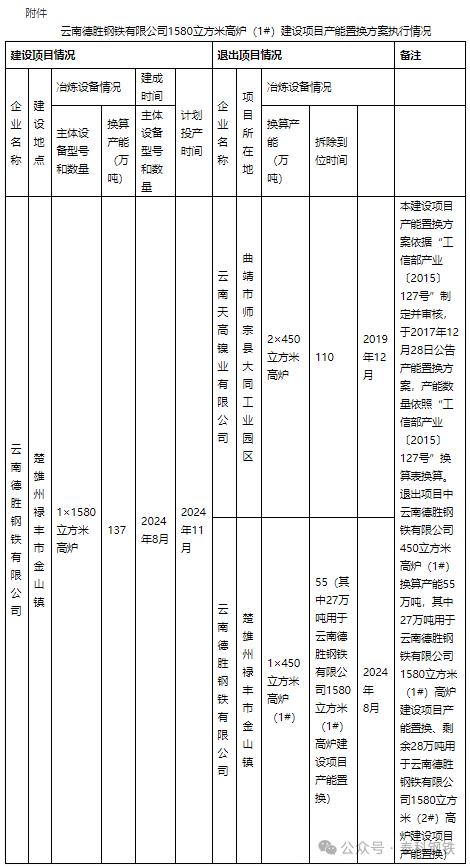 根據(jù)《國務(wù)院關(guān)于化解產(chǎn)能嚴(yán)重過剩矛盾的指導(dǎo)意見》(國發(fā)〔2013〕41號)、《國務(wù)院關(guān)于鋼鐵行業(yè)化解過剩產(chǎn)能實(shí)現(xiàn)脫困發(fā)展的意見》(國發(fā)〔2016〕6號)、《工業(yè)和信息化部關(guān)于印發(fā)部分產(chǎn)能嚴(yán)重過剩行業(yè)產(chǎn)能置換實(shí)施辦法的通知》(工信部產(chǎn)業(yè)〔2015〕127號)文件精神,2017年12月28日云南省工業(yè)和信息化廳門戶網(wǎng)站發(fā)布了《云南德勝鋼鐵有限公司轉(zhuǎn)型升級改造項(xiàng)目產(chǎn)能等量置換方案》(云南省工業(yè)和信息化委員會公告2017年第20號)。目前,該產(chǎn)能置換方案中1580立方米(1#)高爐已建成,為監(jiān)督落實(shí)產(chǎn)能置換方案公告后的執(zhí)行,根據(jù)企業(yè)申請,在楚雄州工業(yè)和信息化局對云南德勝鋼鐵有限公司1580立方米高爐(1#)產(chǎn)能置換方案執(zhí)行情況完成州級核實(shí)驗(yàn)收的基礎(chǔ)上,云南省工業(yè)和信息化廳組織開展了省級驗(yàn)收?,F(xiàn)將《云南德勝鋼鐵有限公司轉(zhuǎn)型升級改造項(xiàng)目產(chǎn)能等量置換方案》(云南省工業(yè)和信息化委員會公告2017年第20號)中1580立方米高爐(1#)產(chǎn)能置換方案執(zhí)行情況予以公告(詳見附件),歡迎社會公眾進(jìn)行監(jiān)督。聯(lián)系電話:0871-63512714、63512693。附件:云南德勝鋼鐵有限公司1580立方米高爐(1#)建設(shè)項(xiàng)目產(chǎn)能置換方案執(zhí)行情況