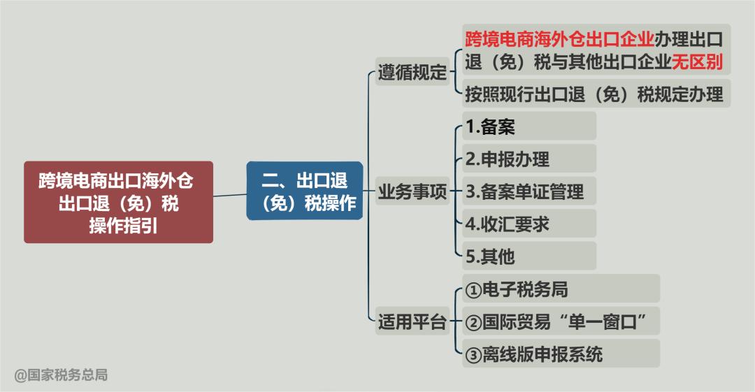 幫助企業(yè)深入準(zhǔn)確理解出口退(免)稅政策規(guī)定,熟練掌握出口退(免)稅業(yè)務(wù)辦理操作流程,更好地適應(yīng)行業(yè)發(fā)展新形勢(shì),國(guó)家稅務(wù)總局近日發(fā)布《跨境電商出口海外倉(cāng)出口退(免)稅操作指引》,旨在為跨境電商出口海外倉(cāng)企業(yè)提供詳實(shí)辦稅指導(dǎo)。國(guó)家稅務(wù)總局將指引內(nèi)容梳理為思維導(dǎo)圖,跨境電商出口海外倉(cāng)出口退(免)稅操作指引——出口退(免)稅操作。