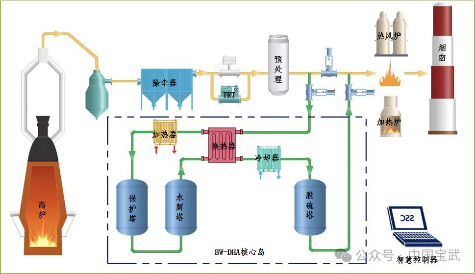 BW-DHA是寶武水務(wù)自主研發(fā)、具有獨立知識產(chǎn)權(quán)的高爐煤氣精脫硫源頭治理技術(shù),具備“高、低、長”三大特征,“高”指高效率、“低”指低能耗、“長”指長壽命。同時,針對行業(yè)痛點,寶武水務(wù)研發(fā)出的“煤氣調(diào)質(zhì)”“高活性抗毒水解劑”“熱量循環(huán)回收”“動態(tài)控溫”“智慧運行”等五大核心技術(shù)大大提升了煤氣的質(zhì)量,使其能夠更好地應(yīng)用于發(fā)電、加熱等環(huán)節(jié),提高能源利用效率,同時也減少了對周邊環(huán)境的影響。其中,煤氣調(diào)質(zhì)技術(shù)采用多級預(yù)處理,能有效去除高爐煤氣中的有害物質(zhì),延長水解劑的使用壽命,穩(wěn)定TRT(高爐煤氣余壓透平發(fā)電裝置)出口煤氣溫度。