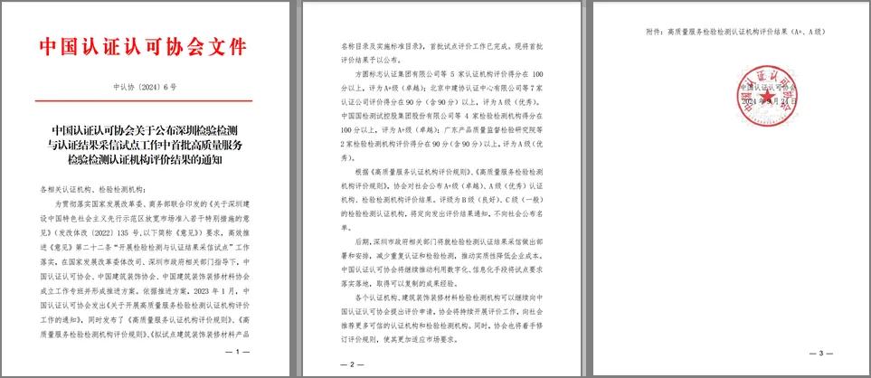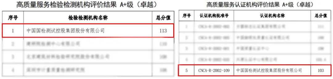 近日,中國認證認可協(xié)會公布深圳檢驗檢測與認證結果采信試點工作中首批高質(zhì)量服務檢驗檢測認證機構評價結果。國檢集團在檢驗檢測機構和認證機構兩類榜單中均喜獲最高A+級(卓越)。