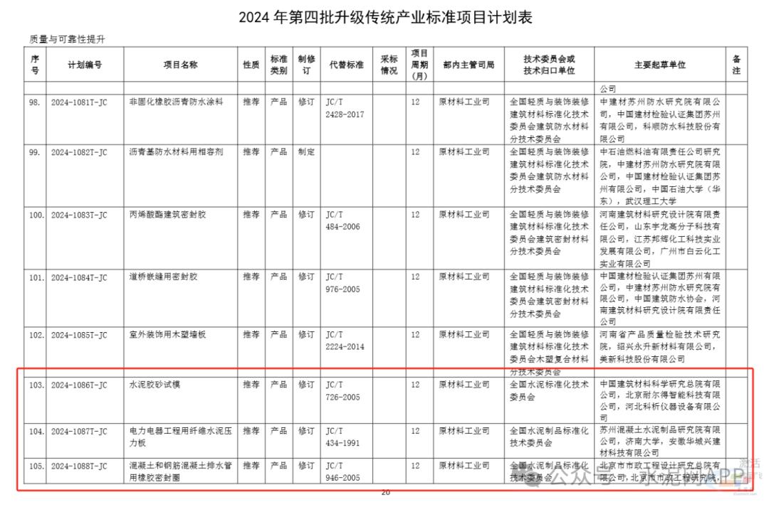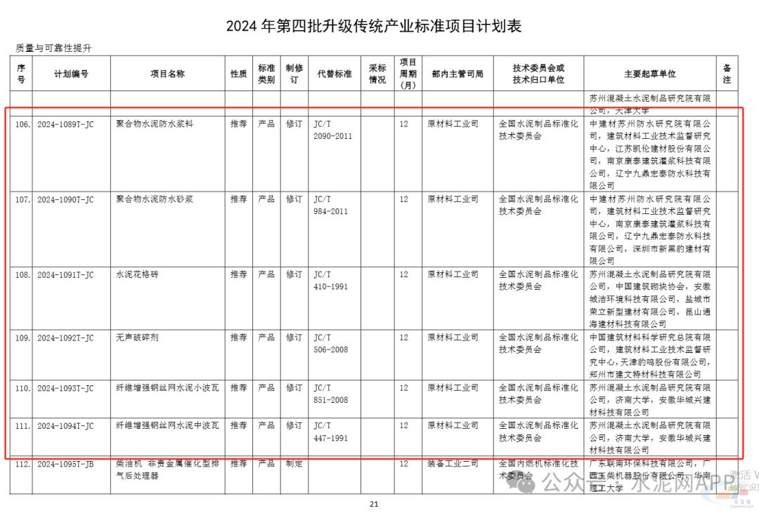 9月14日,工業(yè)和信息化部辦公廳發(fā)布關(guān)于印發(fā)2024年第四批行業(yè)標(biāo)準(zhǔn)制修訂計劃的通知。2024年第四批升級傳統(tǒng)產(chǎn)業(yè)標(biāo)準(zhǔn)項目計劃中,多個項目與水泥行業(yè)相關(guān),整理如下: