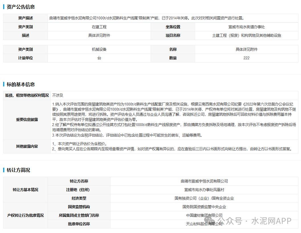 日前,據(jù)某交易平臺顯示,曲靖市宣威宇恒水泥有限公司部分資產(chǎn)(1000t/d 水泥熟料生產(chǎn)線)轉(zhuǎn)讓,底價為522.31萬元。