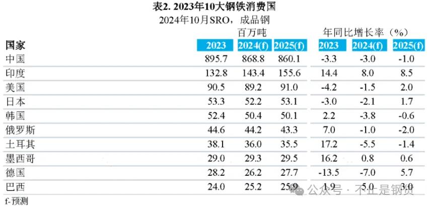 受印度強勁增長和其他主要新興經濟體反彈的推動,發(fā)展中國家(中國除外)的鋼鐵需求將在2024年和2025年分別增長3.5%和4.2%。
