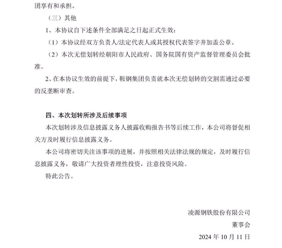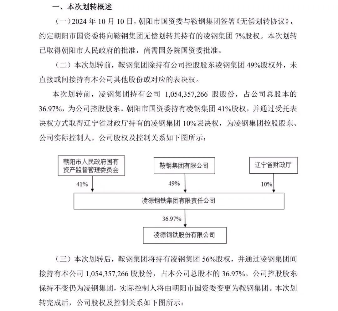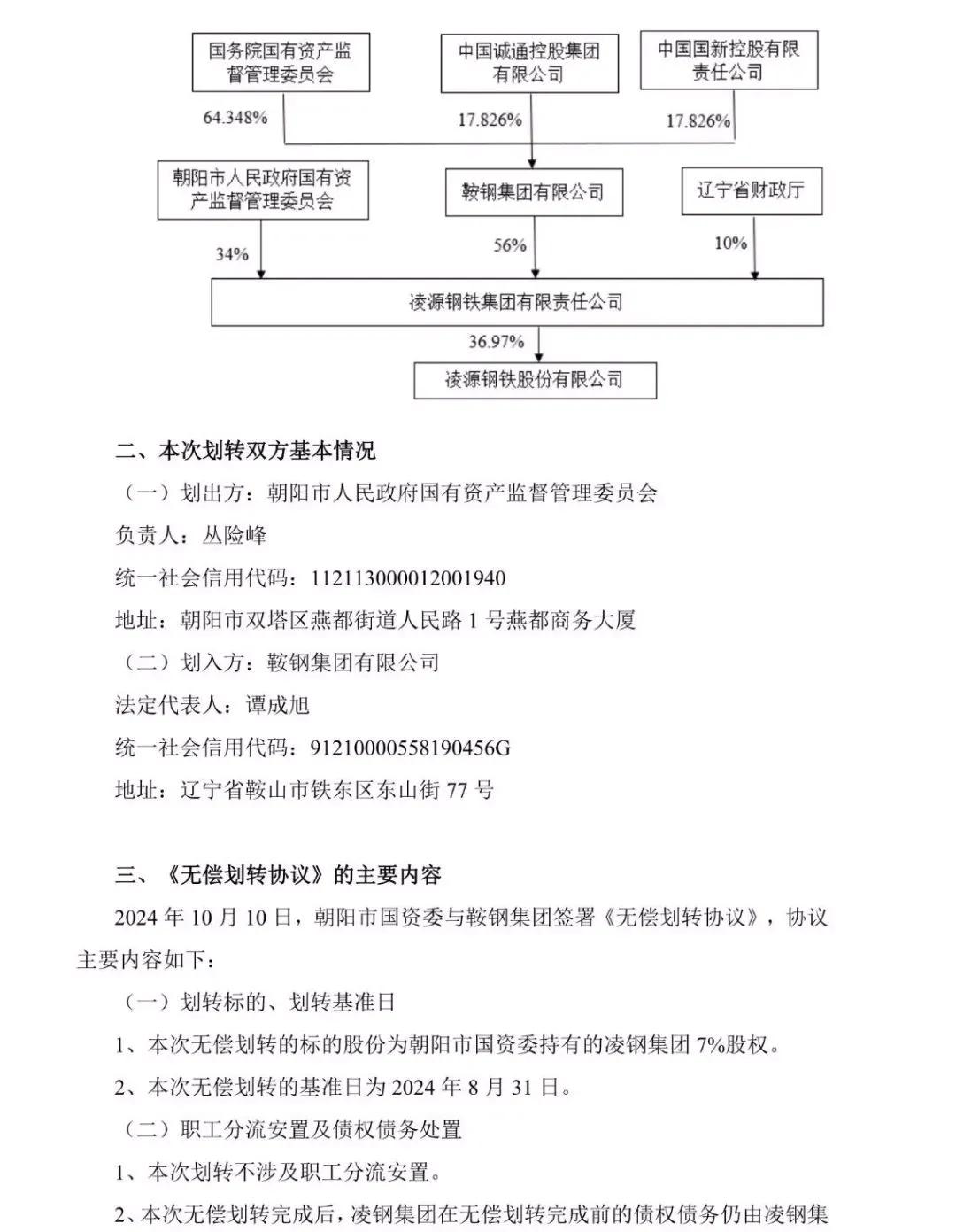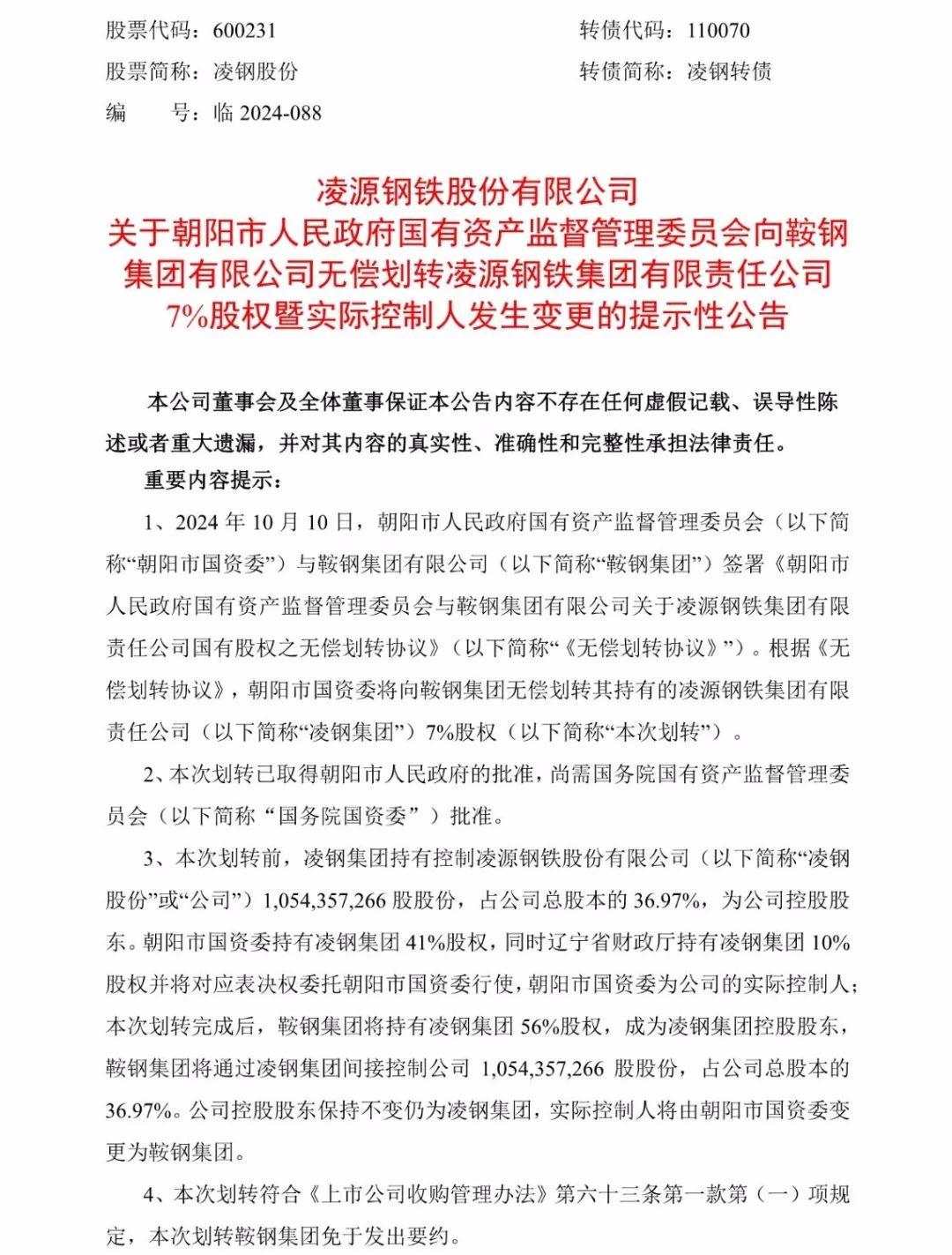 凌鋼股份10月10日晚間發(fā)布公告稱,朝陽(yáng)市國(guó)資委與鞍鋼集團(tuán)簽署《無償劃轉(zhuǎn)協(xié)議》,約定朝陽(yáng)市國(guó)資委將向鞍鋼集團(tuán)無償劃轉(zhuǎn)其持有的凌鋼集團(tuán) 7%股權(quán)。本次劃轉(zhuǎn)已取得朝陽(yáng)市人民政府的批準(zhǔn),尚需國(guó)務(wù)院國(guó)資委批準(zhǔn)。