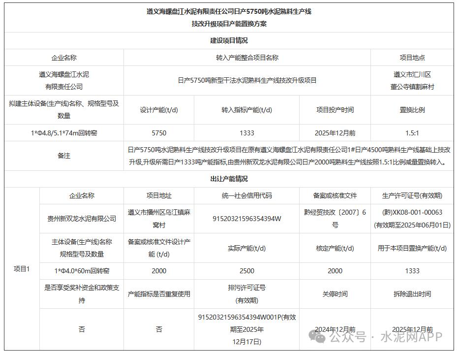 公示顯示,日產(chǎn)5750噸水泥熟料生產(chǎn)線技改升級(jí)項(xiàng)目在原有遵義海螺盤江水泥有限責(zé)任公司1#日產(chǎn)4500噸熟料生產(chǎn)線基礎(chǔ)上技改升級(jí),升級(jí)所需日產(chǎn)1333噸產(chǎn)能指標(biāo),由貴州新雙龍水泥有限公司日產(chǎn)2000噸熟料生產(chǎn)線按照1.5:1比例減量置換轉(zhuǎn)入。