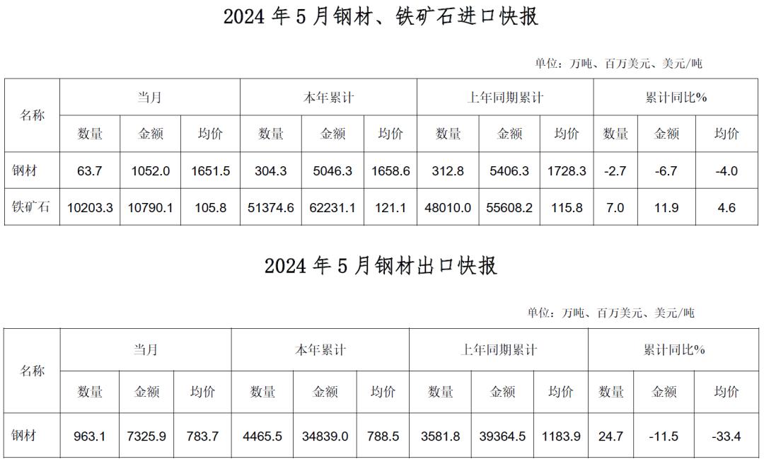根據(jù)海關(guān)統(tǒng)計(jì)快訊數(shù)據(jù),2024年5月,我國進(jìn)口鋼材63.7萬噸,環(huán)比減少2.1萬噸,下降3.2%;均價(jià)1651.5美元/噸,環(huán)比減少55.9美元/噸,下降3.3%。1-5月累計(jì)進(jìn)口鋼材304.3萬噸,同比減少8.5萬噸,下降2.7%。