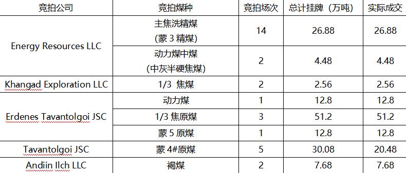 截至10月24日,據(jù)統(tǒng)計(jì)數(shù)據(jù)顯示,蒙古在10月共進(jìn)行了30場(chǎng)線上競(jìng)拍,其中主流煤種Energy Resources LLC公司蒙3精煤共進(jìn)行了14場(chǎng)競(jìng)拍,總計(jì)掛牌26.88萬(wàn)噸,實(shí)際26.88萬(wàn)噸;Tavantolgoi JSC公司蒙4在本月共進(jìn)行了5場(chǎng)競(jìng)拍,總計(jì)掛牌30.08萬(wàn)噸,實(shí)際成交20.48萬(wàn)噸;Erdenes Tavantolgoi JSC公司在本月共進(jìn)行了5場(chǎng)競(jìng)拍,總計(jì)掛牌76.8萬(wàn)噸,實(shí)際成交76.8萬(wàn)噸,其中ETT公司蒙5原煤時(shí)隔半年進(jìn)行線上競(jìng)拍,掛牌12.8萬(wàn)噸,全部成交,最后交貨時(shí)間2025年2月28日。