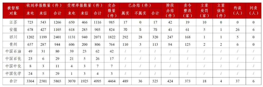 截至10月30日晚20:00,各督察組共收到群眾來電、來信舉報(bào)5865件,受理有效舉報(bào)4995件,經(jīng)梳理合并重復(fù)舉報(bào),累計(jì)向被督察對(duì)象轉(zhuǎn)辦4464件;被督察對(duì)象已辦結(jié)或階段辦結(jié)949件,其中立案處罰18家;立案偵查4件;約談黨政領(lǐng)導(dǎo)干部37人,問責(zé)黨政領(lǐng)導(dǎo)干部6人。