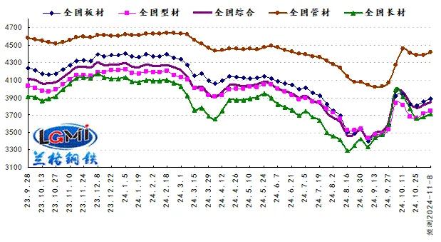 11月初,全球?qū)⒏雨P(guān)注美國(guó)大選、美聯(lián)儲(chǔ)降息預(yù)期以及中國(guó)財(cái)政增量政策的落地,目前各地區(qū)各部門(mén)要認(rèn)真貫徹中央政治局會(huì)議確定的一系列重大舉措,把各項(xiàng)存量政策和增量政策落實(shí)到位,打好組合拳,切實(shí)抓好后兩個(gè)月的各項(xiàng)工作,努力實(shí)現(xiàn)全年經(jīng)濟(jì)社會(huì)發(fā)展目標(biāo)任務(wù)。要緊緊圍繞努力實(shí)現(xiàn)全年經(jīng)濟(jì)社會(huì)發(fā)展目標(biāo),持續(xù)抓好一攬子增量政策的落地落實(shí),及時(shí)評(píng)估和優(yōu)化政策,加大逆周期調(diào)節(jié)力度,進(jìn)一步提升宏觀調(diào)控成效。同時(shí)更加注重政策和市場(chǎng)的互動(dòng),充分調(diào)動(dòng)各方面積極性,更好激發(fā)增長(zhǎng)動(dòng)能。從黑色系期貨盤(pán)面來(lái)看,黑色系周五總體收跌,多數(shù)品種單日跌幅在1%以上。從螺紋主力01合約來(lái)看,周結(jié)算價(jià)3429,較上周結(jié)算價(jià)高90個(gè)點(diǎn),周度的價(jià)格重心略有上移。下周重點(diǎn)關(guān)注下方3350附近支撐,上方則關(guān)注3400、3450兩個(gè)關(guān)鍵壓力位。如受美大選等事件影響,仍穩(wěn)定在3400關(guān)口之上,仍有繼續(xù)向上的空間。從鋼材現(xiàn)貨市場(chǎng)來(lái)看,供給端:由于鋼廠品種盈利的不斷收窄甚至虧損,產(chǎn)能釋放力度逐漸轉(zhuǎn)弱,鐵水產(chǎn)量小幅下降,而品種產(chǎn)量則表現(xiàn)不一。需求端:由于市場(chǎng)依然處于傳統(tǒng)旺季需求,市場(chǎng)成交呈現(xiàn)低位上升的局面,“買(mǎi)漲不買(mǎi)跌”心態(tài)依然占據(jù)主流。成本端:由于鐵礦石價(jià)格小幅上漲,廢鋼價(jià)格小幅震蕩,焦炭?jī)r(jià)格保持穩(wěn)定,使得生產(chǎn)成本支撐韌性再現(xiàn)。因此蘭格鋼鐵研究中心預(yù)計(jì)(2024.11.4-11.8)國(guó)內(nèi)鋼材市場(chǎng)將在國(guó)內(nèi)外多重因素相互交織、終端需求維持釋放、鋼廠供給開(kāi)始收縮、市場(chǎng)成交低位上升、成本支撐韌性再現(xiàn)的影響下,國(guó)內(nèi)鋼市或?qū)⒃陬A(yù)期與現(xiàn)實(shí)的頻繁轉(zhuǎn)換中呈現(xiàn)震蕩上沖的行情。