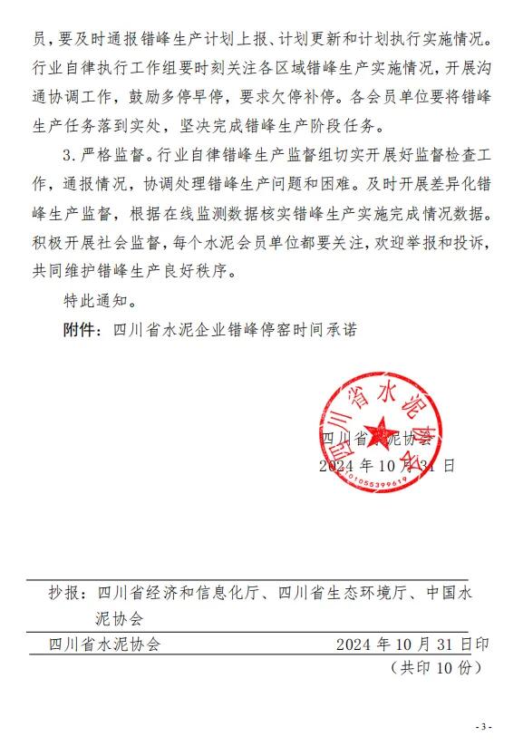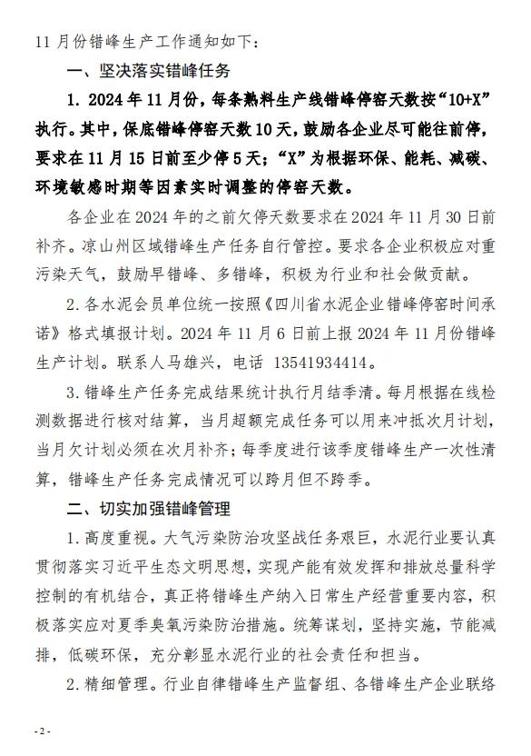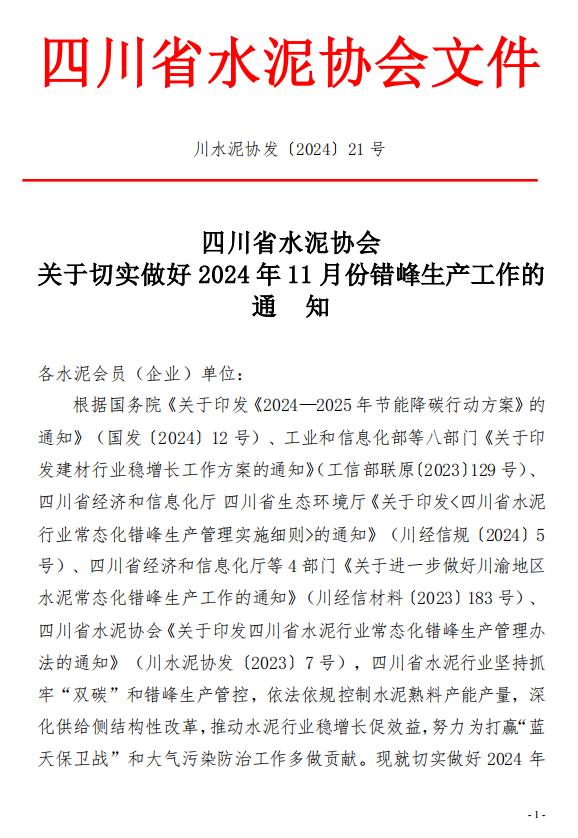 近日,四川省水泥協(xié)會(huì)發(fā)布“關(guān)于切實(shí)做好2024年11月份錯(cuò)峰生產(chǎn)工作的通知”。2024年11月份,每條熟料生產(chǎn)線錯(cuò)峰停窯天數(shù)按“10+X執(zhí)行。其中,保底錯(cuò)峰停窯天數(shù)10天,鼓勵(lì)各企業(yè)盡可能往前停要求在11月15日前至少停5天;“X”為根據(jù)環(huán)保、能耗、減碳環(huán)境敏感時(shí)期等因素實(shí)時(shí)調(diào)整的停窯天數(shù)。各企業(yè)在 2024 年的之前欠停天數(shù)要求在2024年11月30 日前補(bǔ)齊。涼山州區(qū)域錯(cuò)峰生產(chǎn)任務(wù)自行管控。要求各企業(yè)積極應(yīng)對(duì)重污染天氣,鼓勵(lì)早錯(cuò)峰、多錯(cuò)峰,積極為行業(yè)和社會(huì)做貢獻(xiàn)。