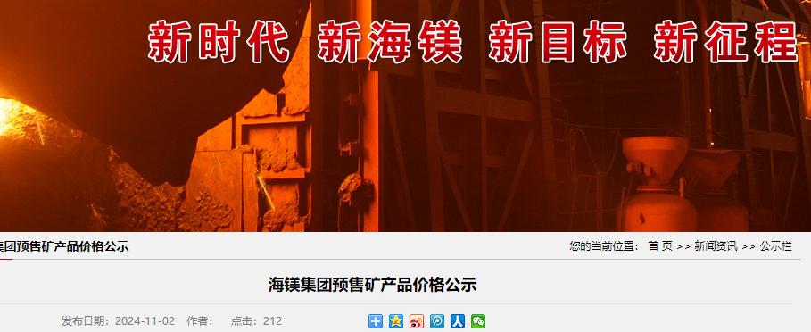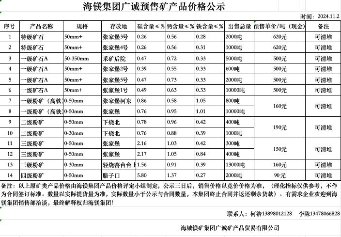 海鎂集團廣誠預售礦產(chǎn)品價格公示