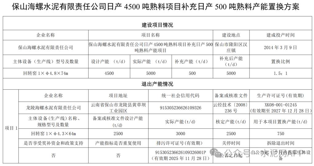 根據(jù)公示,保山海螺水泥有限責(zé)任公司日產(chǎn)4500噸熟料項目于2014年3月9日建成投產(chǎn),該項目需補充產(chǎn)能500t/d,置換比例1.5:1。