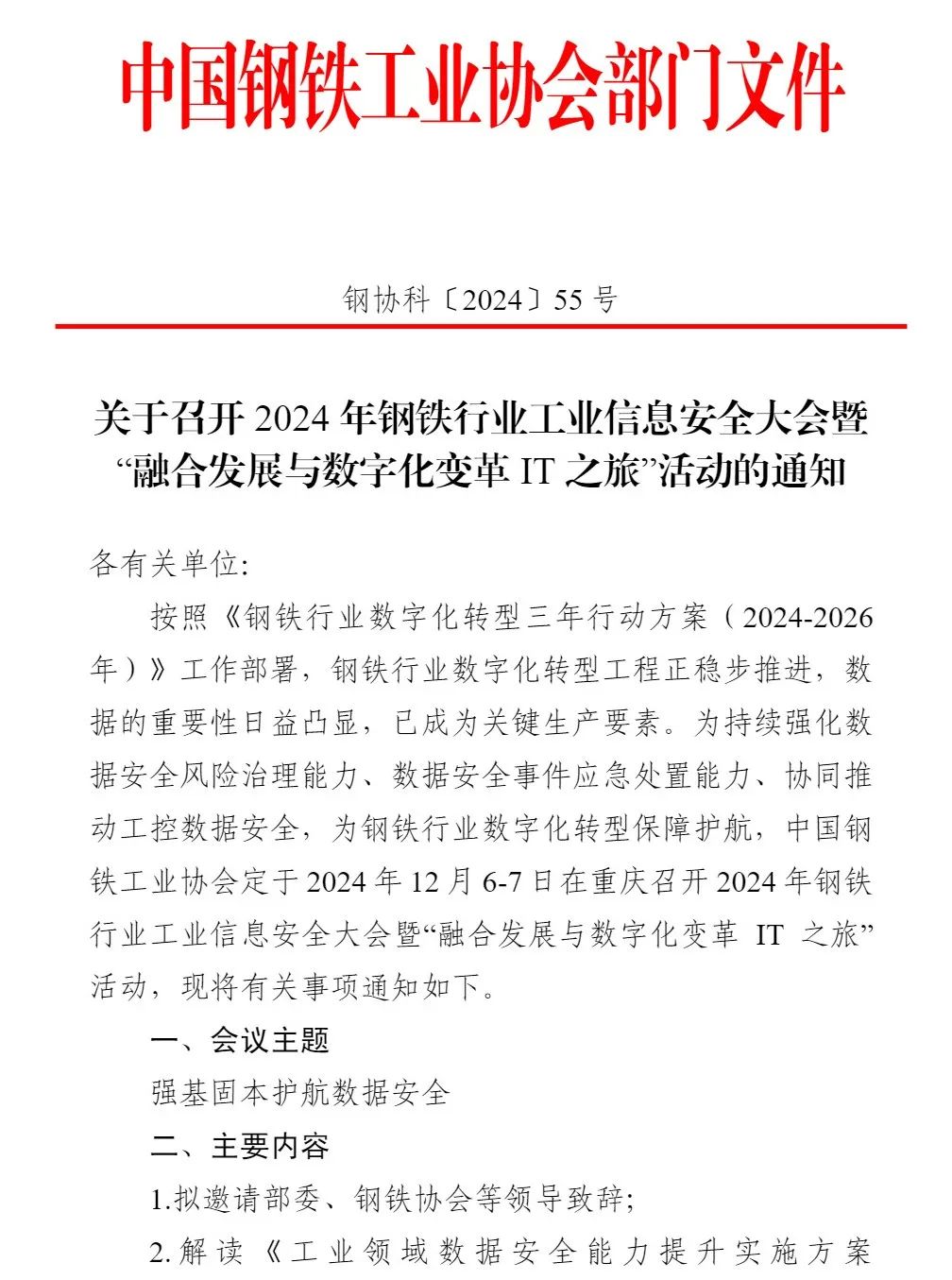 關(guān)于召開2024年鋼鐵行業(yè)工業(yè)信息安全大會暨“融合發(fā)展與數(shù)字化變革IT之旅”活動的通知
