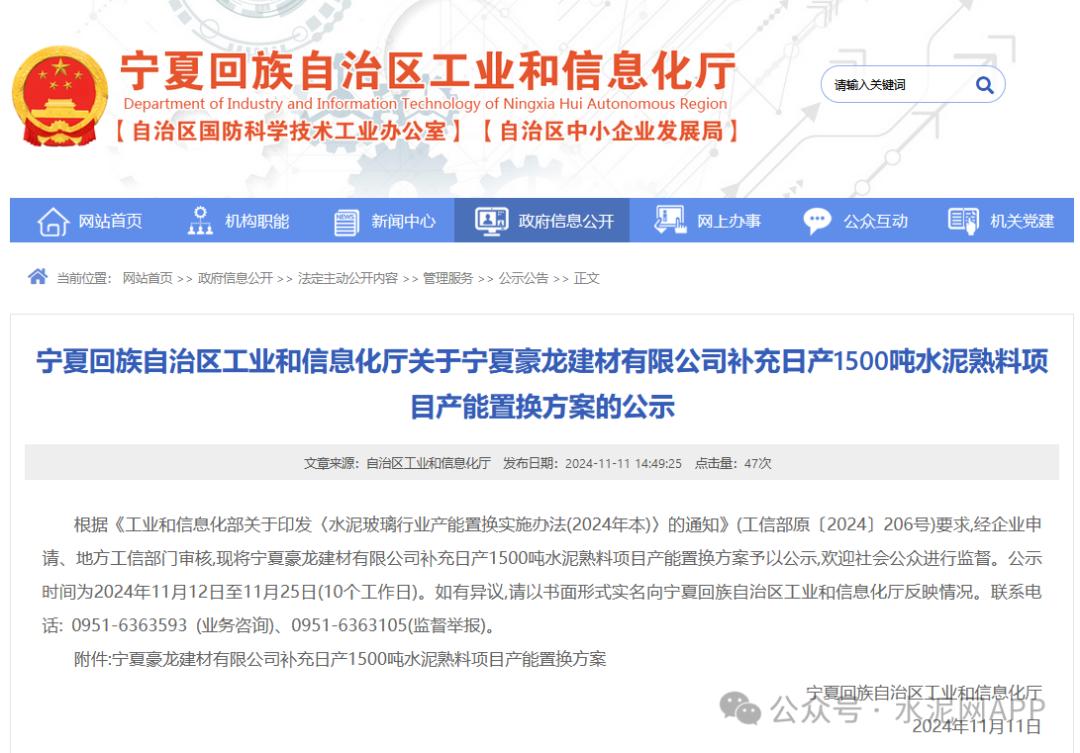 11月11日,寧夏工信廳發(fā)布“關(guān)于寧夏豪龍建材有限公司補充日產(chǎn)1500噸水泥熟料項目產(chǎn)能置換方案的公示”。