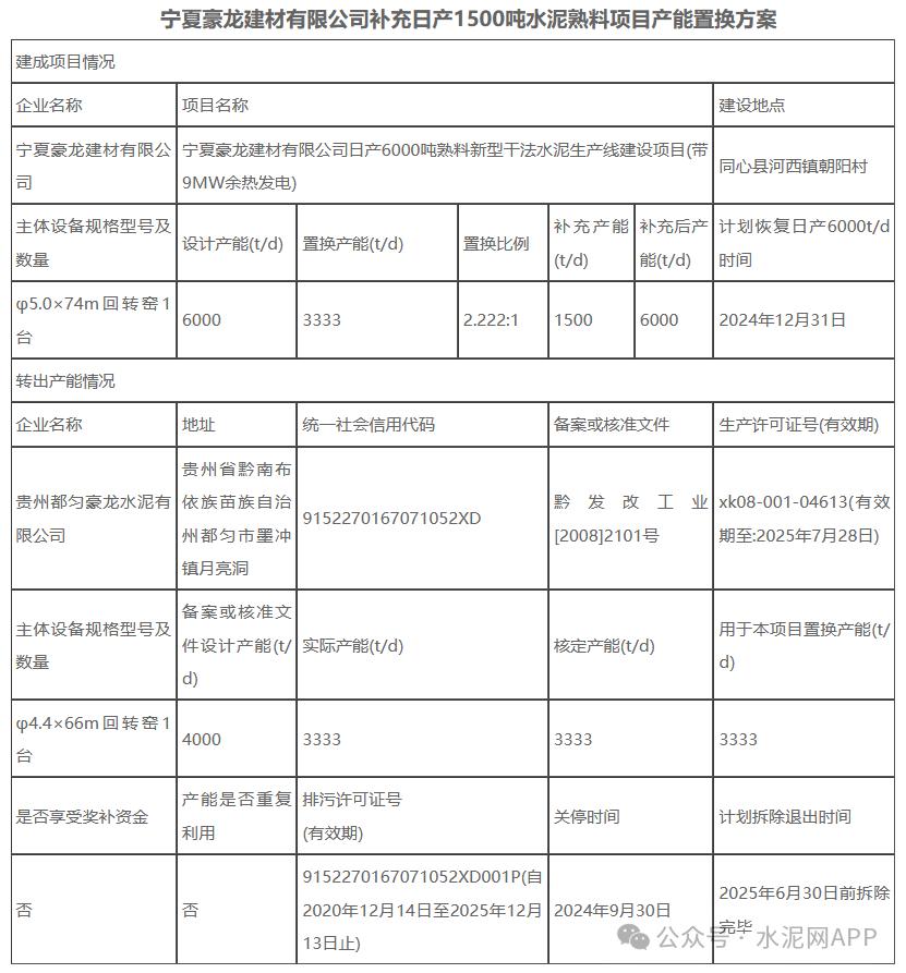 置換方案中顯示,貴州都勻豪龍水泥有限公司出讓產(chǎn)能3333t/d,用于寧夏豪龍建材6000t/d熟料生產(chǎn)線項目補充產(chǎn)能,補充產(chǎn)能為1500t/d,置換比例2.222:1。