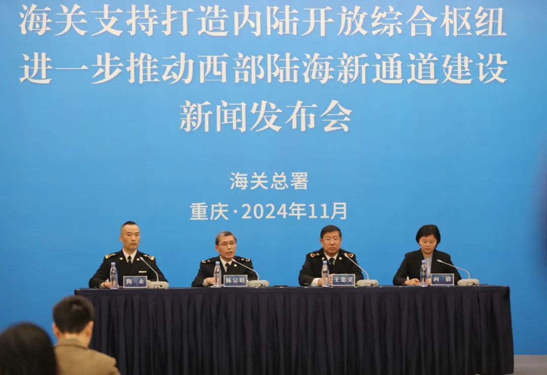 海關(guān)總署11月12日上午10時在重慶舉辦“海關(guān)支持打造內(nèi)陸開放綜合樞紐 進(jìn)一步推動西部陸海新通道建設(shè)”新聞發(fā)布會。海關(guān)總署綜合業(yè)務(wù)司副司長陳宗旺、重慶海關(guān)副關(guān)長王忠文、重慶市政府口岸物流辦副主任向倩出席介紹支持西部陸海新通道建設(shè)情況,并答記者問。