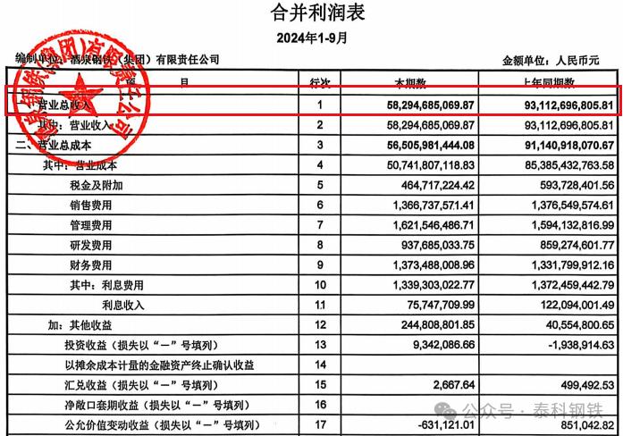 近日,酒泉鋼鐵(集團(tuán))有限責(zé)任公司2024年三季度合并及母公司財(cái)務(wù)報(bào)表公布,酒鋼集團(tuán)2024年1-9月?tīng)I(yíng)收582.95億元(2023年同期933.12億元),凈利潤(rùn)11.64億元(2023年同期17.45億元)。