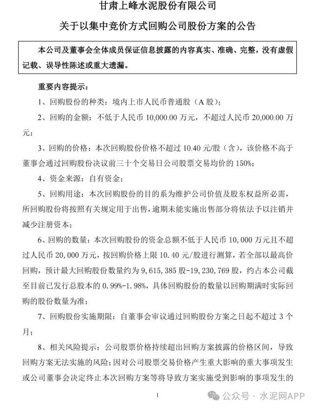 上峰水泥6月17日晚間發(fā)布公告稱,為維護公司價值及股東權益,立足公司長期可持續(xù)發(fā)展和價值增長,增強投資者對公司的投資信心,公司管理層在綜合考慮公司股票近期二級市場表現(xiàn),結合公司財務狀況、經營情況以及未來盈利能力和發(fā)展前景,公司擬以自有資金進行股份回購。