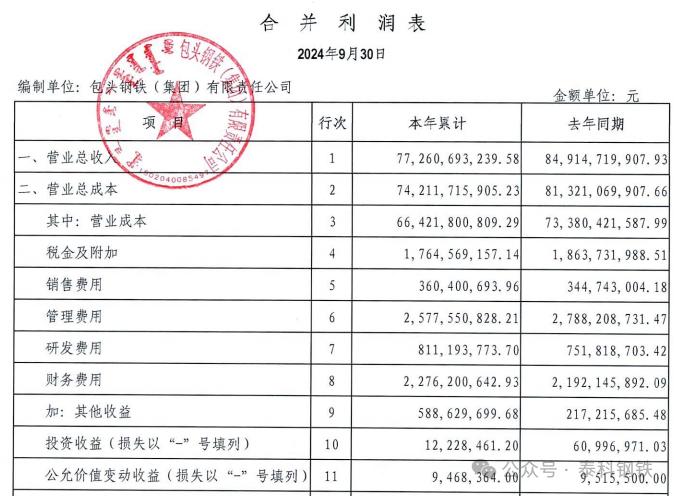 近日,包頭鋼鐵(集團(tuán))有限責(zé)任公司2024年三季度合并及母公司財(cái)務(wù)報(bào)表公布,包鋼集團(tuán)2024年1-9月?tīng)I(yíng)收772.61億元(2023年同期849.15億元),凈利潤(rùn)20.87億元(2023年同期21.82億元)。