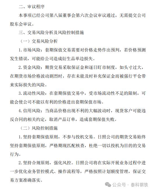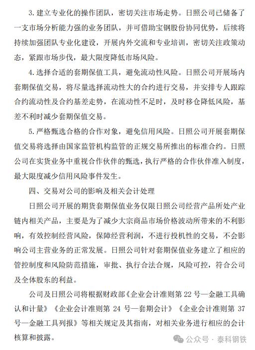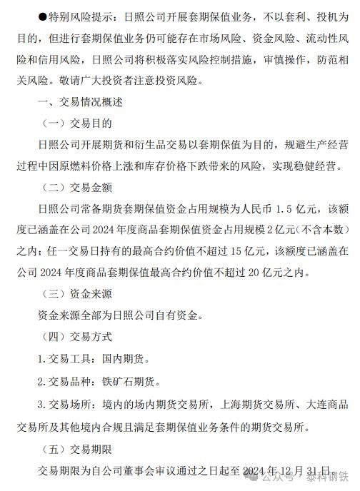 公告披露,山鋼日照常備期貨套期保值資金占用規(guī)模為1.5億元,該額度已涵蓋在該公司2024年度商品套期保值資金占用規(guī)模2億元(不含本數(shù))之內(nèi);任一交易日持有的最高合約價值不超過15億元,該額度已涵蓋在該公司2024年度商品套期保值最高合約價值不超過20億元之內(nèi)。該公司擬開展商品類金融衍生品業(yè)務的品種為鐵礦石期貨,期貨交易以套期保值為目的,規(guī)避生產(chǎn)經(jīng)營過程中因原燃料價格上漲和庫存價格下跌帶來的風險,實現(xiàn)穩(wěn)健經(jīng)營。