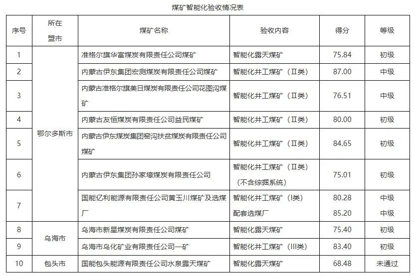 內(nèi)蒙古10處煤礦智能化驗(yàn)收結(jié)果公示