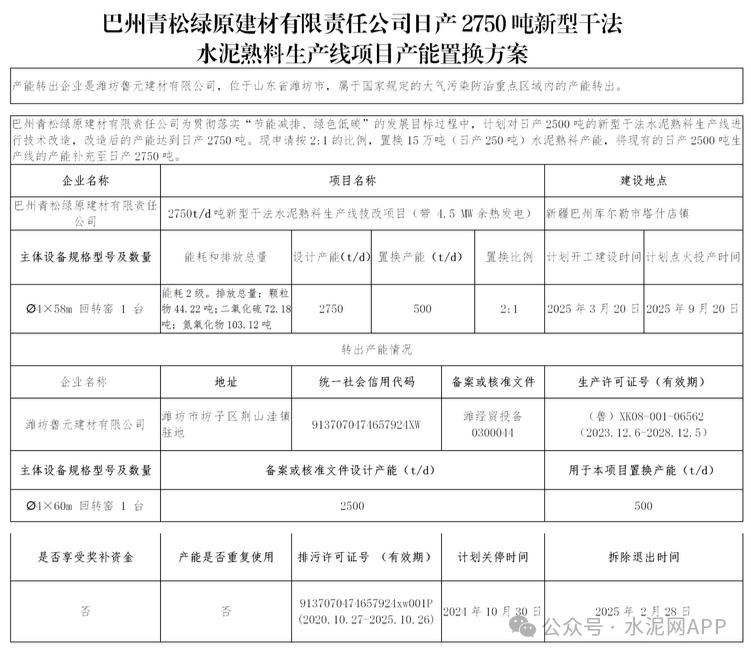 巴州青松綠原建材有限責(zé)任公司計(jì)劃對(duì)日產(chǎn)2500噸的新型干法水泥熟料生產(chǎn)線進(jìn)行技術(shù)改造,改造后的產(chǎn)能達(dá)到日產(chǎn)2750噸?,F(xiàn)申請(qǐng)按2:1的比例,置換15萬(wàn)噸(日產(chǎn)250噸)水泥熟料產(chǎn)能,將現(xiàn)有的日產(chǎn)2500噸生產(chǎn)線的產(chǎn)能補(bǔ)充至日產(chǎn)2750噸。