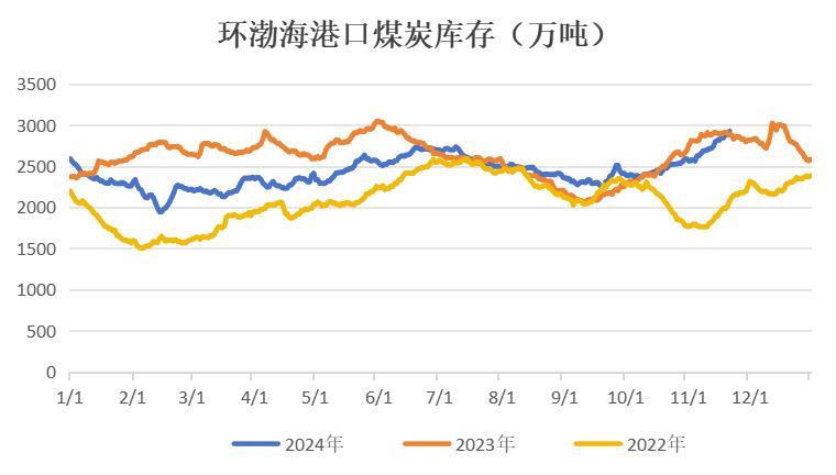 近期國內(nèi)煤炭供應(yīng)持續(xù)高位,進(jìn)入冬季用煤高峰,政府表態(tài)要求推進(jìn)煤炭保供工作,12月份國內(nèi)煤炭供應(yīng)仍有增量空間。大秦線秋季檢修結(jié)束后,鐵路運(yùn)輸能力充足釋放,持續(xù)保持發(fā)運(yùn)量高位,港口輸入量多、消耗量少,煤炭庫存持續(xù)升高。截至目前,環(huán)渤海港口庫存總庫存2924.6萬噸,已近逼近3000萬噸大關(guān),位于同期較高水平。當(dāng)前全國統(tǒng)調(diào)電廠存煤保持在2億噸以上、平均可用超過30天,終端整體庫存充足,補(bǔ)貨意愿不強(qiáng)。非電行業(yè)也沒有有力支撐,所以僅僅維持剛需采購。