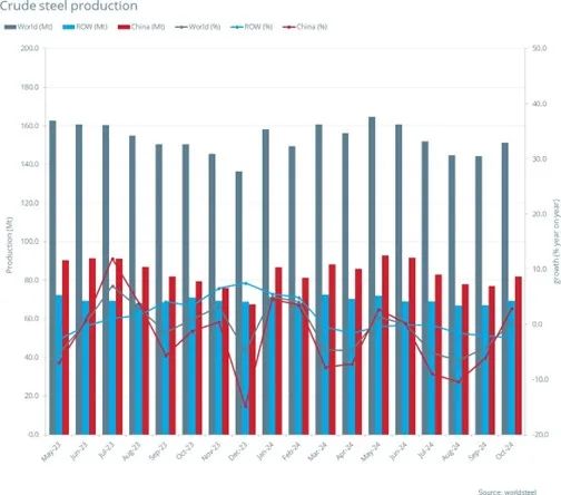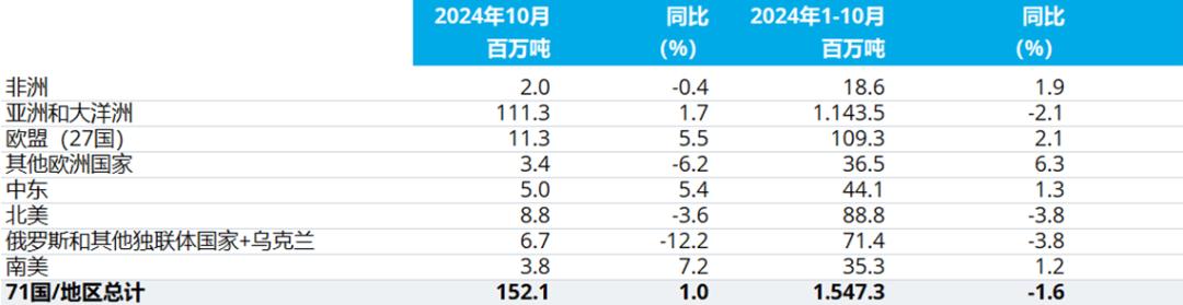 2024年10月全球71個(gè)納入世界鋼鐵協(xié)會(huì)統(tǒng)計(jì)國(guó)家/地區(qū)的粗鋼產(chǎn)量為1.521億噸,同比提高1.0%。