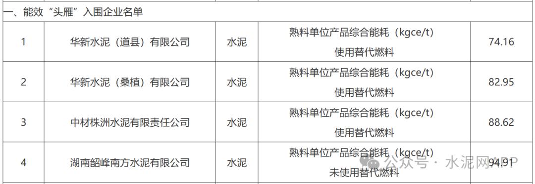 其中,華新水泥(道縣)有限公司、華新水泥(桑植)有限公司、中材株洲水泥有限責(zé)任公司、湖南韶峰南方水泥有限公司4家水泥企業(yè)擬入選能效“頭雁”入圍企業(yè)名單。