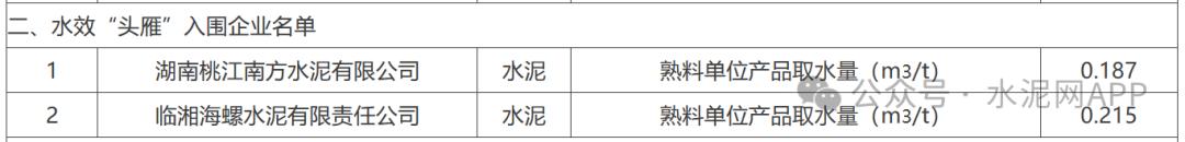 湖南桃江南方水泥有限公司、臨湘海螺水泥有限責(zé)任公司2家水泥企業(yè)擬入選水效“頭雁”入圍企業(yè)名單。