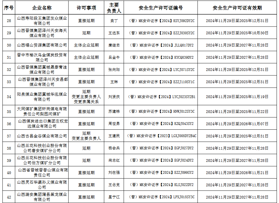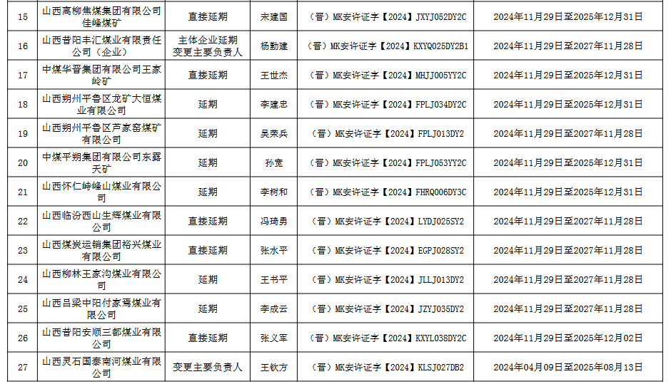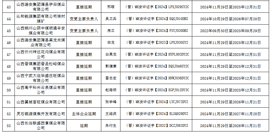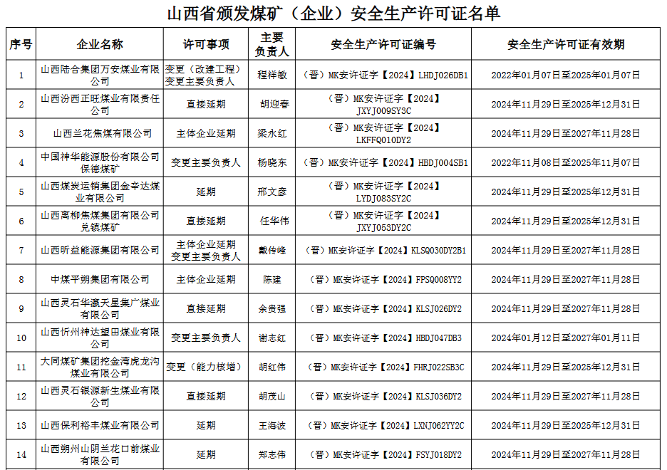山西省應急管理廳關于頒發(fā)煤礦(企業(yè))安全生產(chǎn)許可證的公告 經(jīng)研究,按照有關規(guī)定,為山西陸合集團萬安煤業(yè)有限公司等53座煤礦(企業(yè))頒發(fā)安全生產(chǎn)許可證,現(xiàn)進行公告。 公告期:2024年11月30日至2024年12月06日。