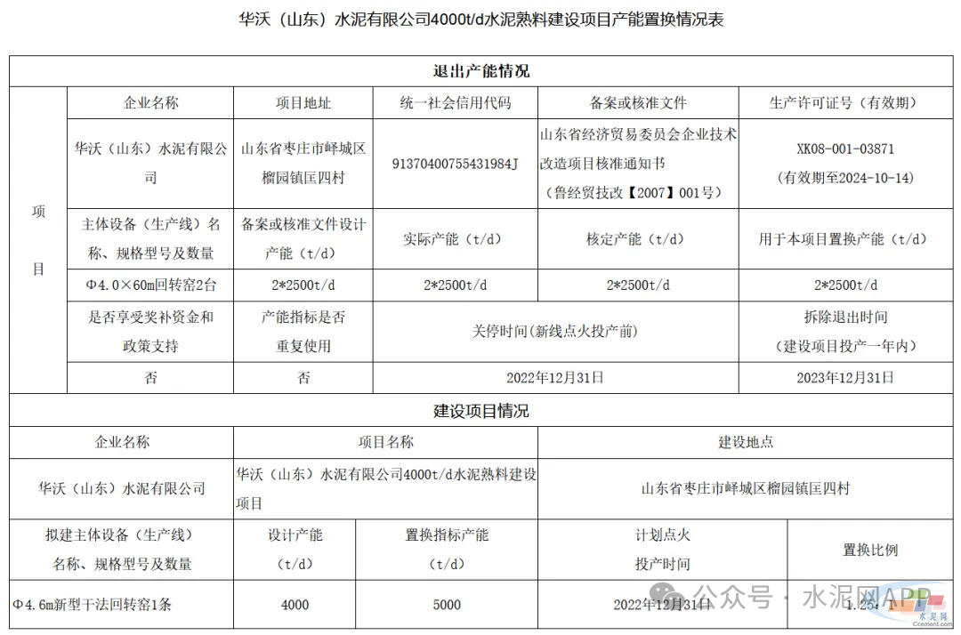 據(jù)產能置換表顯示,華沃(山東)水泥有限公司將2條2500t/d水泥熟料生產線以1.25:1的置換比例新建1條4000t/d水泥熟料生產線。