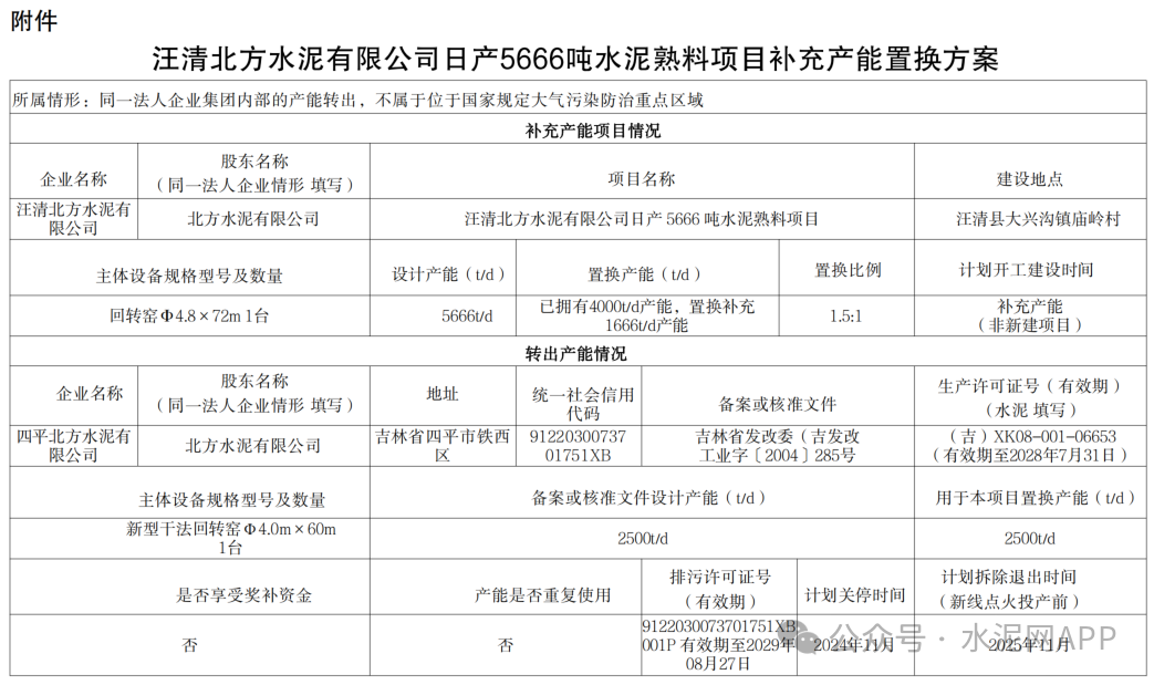 文件顯示,四平北方水泥有限公司退出一條2500t/d熟料生產(chǎn)線,用于汪清北方水泥有限公司置換補充1666t/d產(chǎn)能,置換補充后生產(chǎn)線達到5666t/d熟料,置換比例1.5:1。