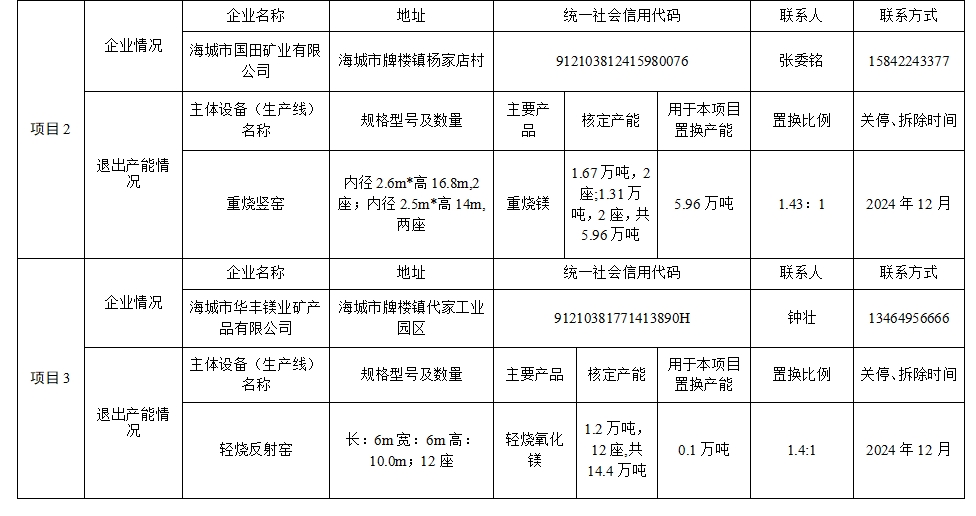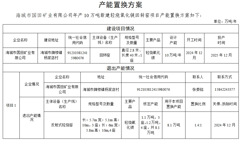 按照《遼寧省人民政府辦公廳關(guān)于推進(jìn)菱鎂行業(yè)高質(zhì)量發(fā)展的實(shí)施意見》(遼政辦發(fā)〔2023〕15號)、《遼寧省菱鎂礦浮選及鎂砂行業(yè)產(chǎn)能置換辦法》(遼工信建材〔2024〕18號)要求,根據(jù)菱鎂行業(yè)專項(xiàng)整治工作進(jìn)展,經(jīng)企業(yè)申請、市工信部門初審、我廳審核,現(xiàn)將海城市國田礦業(yè)有限公司等8戶企業(yè)新建輕燒氧化鎂項(xiàng)目產(chǎn)能置換方案予以公示,公示期10個(gè)工作日。