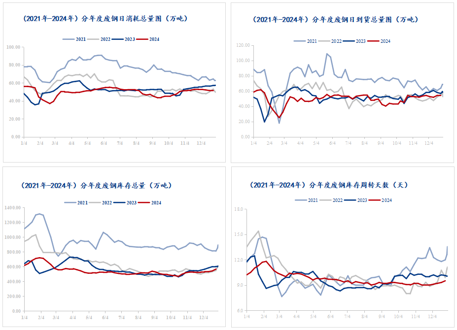 截止12月12日,我的鋼鐵300家長、短流程代表鋼廠廢鋼庫存總量566.03萬噸,較上周增加25.05萬噸,增幅4.63%;庫存周轉(zhuǎn)天數(shù)9.5天,較上周增0.2天;日消耗總量51.76萬噸,較上周增加0.55%;日到貨總量54.56萬噸,較上周增加0.61%。上周的鋼廠廢鋼庫存大幅上升,周度增幅明顯擴大,月環(huán)比增加39.23萬噸,增幅7.45%,年同比下降36.17萬噸,降幅6.01%。當前庫存水平仍處于低位水平,當前庫存可使用天數(shù)較去年同期下降0.6天,較2024年春節(jié)前峰值下降2.3天,仍有較大增長空間。從春節(jié)前庫存水平來看,2024年春節(jié)前庫存峰值是719.52萬噸,2023年同期峰值是727.46萬噸,從今年供應減少以及節(jié)前消耗情況來考慮,預計2025年春節(jié)前庫存水平將在640-680萬噸左右。目前鋼廠仍有1個月左右時間進行冬儲備庫,電爐廠處于利潤修復考慮,預計將于元旦前后陸續(xù)停產(chǎn),后期資源流動速度將有所加快,鋼廠廢鋼庫存進入快速累積階段,對行情有較大支撐作用??偨Y(jié):上周全國廢鋼市場先漲后跌,整體小幅偏強運行,鋼廠廢鋼庫存增幅明顯,廢鋼消耗基本持穩(wěn)。電爐廠開工率及產(chǎn)能利用率降幅有限,本月需求仍有一定支撐;供應方面,場地冬儲尚未開始,社會庫存增幅有限,資源供應流動加速。預計本周廢鋼市場將呈現(xiàn)窄幅震蕩走勢,價格相對堅挺運行。