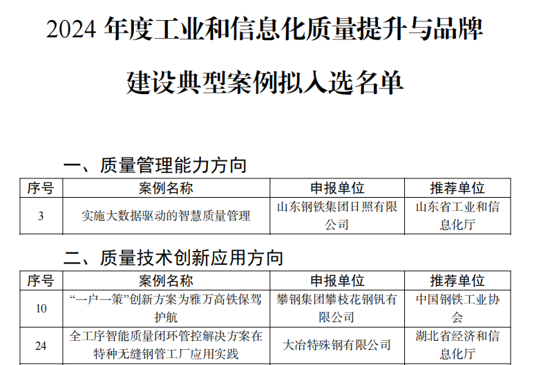 12月10日,工信部發(fā)布了2024年度工業(yè)和信息化質(zhì)量提升與品牌建設典型案例擬入選名單,共包含100項工業(yè)和信息化質(zhì)量提升與品牌建設典型案例。其中,上榜鋼企名單如下: