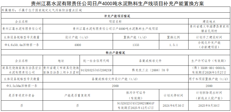 12月16日,貴州省工信廳公示貴州江葛水泥有限責(zé)任公司日產(chǎn)4000噸水泥熟料生產(chǎn)線項(xiàng)目補(bǔ)充產(chǎn)能置換方案。