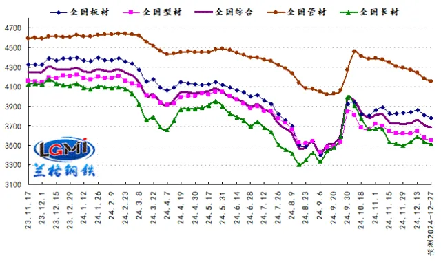 2024年第51周(2024.12.16-12.20)蘭格鋼鐵全國絕對價格指數(shù)為3708元,較上周下降1.2%,較去年同期下降12.9%;其中,蘭格鋼鐵長材絕對價格指數(shù)為3535元,較上周下降1.2%,較去年同期下降13.9%;蘭格鋼鐵型材絕對價格指數(shù)為3574元,較上周下降1.9%,較去年同期下降14.3%;蘭格鋼鐵板材絕對價格指數(shù)為3811元,較上周下降1.1%,較去年同期下降12.6%;蘭格鋼鐵管材絕對價格指數(shù)為4177元,較上周下降1.5%,較去年同期下降9.2%。