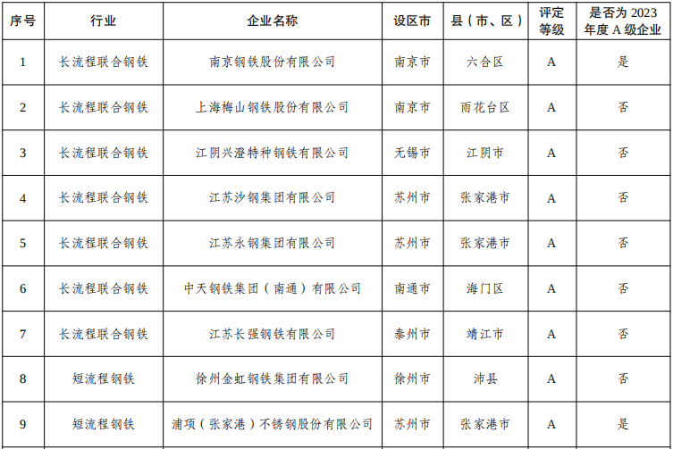 從《公示》中獲悉,包括南京鋼鐵股份有限公司、上海梅山鋼鐵股份有限公司在內(nèi)的9家鋼企為重污染天氣重點行業(yè)績效評價A級企業(yè),中天鋼鐵集團有限公司等12家鋼廠為B(含B-)級企業(yè)。